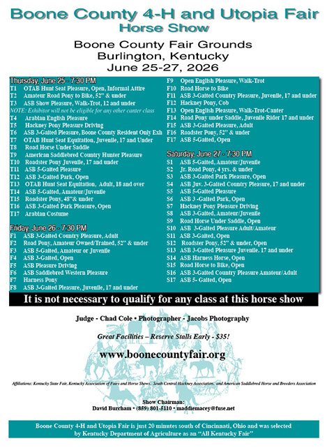 The class, ASB Country Pleasure – Five-Gaited, qualifier and championship have also been added to the schedule. If your horse was shown in these classes during the point qualifying period (July – December 2025), points and/or classes will be counted for your horse. The Kentucky State Fair World’s Championship Qualifying Requirements for Pleasure (Show & Country) and Park will apply to this class.